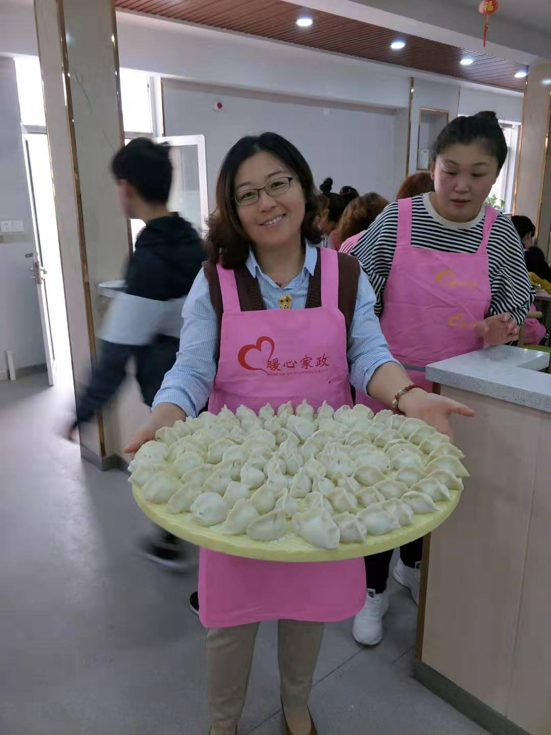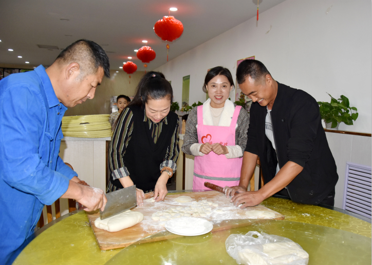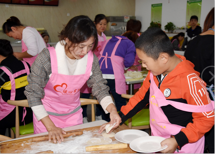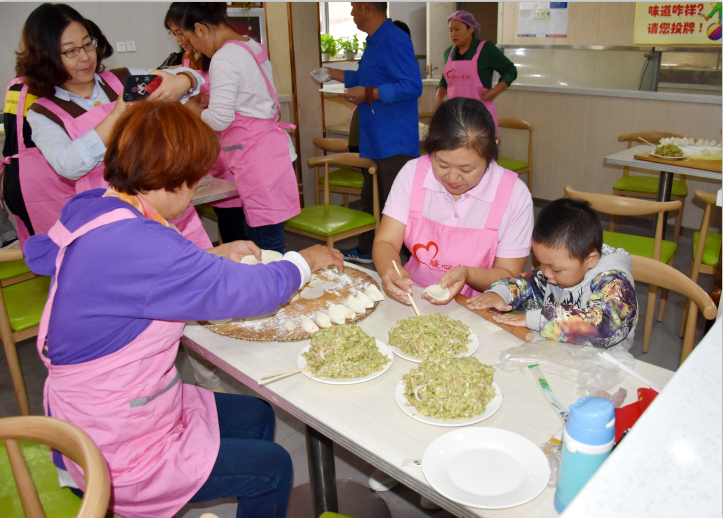 有些大姐還帶了自己家的孩子一起參加這次公益活動,以身作則,以實際行動教育孩子們尊老愛老。孩子們也非?;钴S,不管是包餃子還是搟皮,都積極參與。