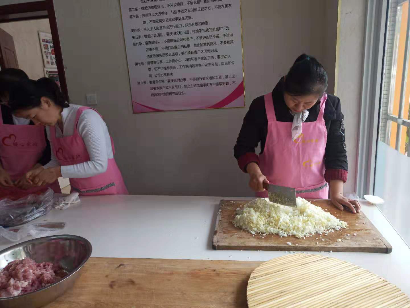 娟姐主動攬了發(fā)面的活,接著劉平大姐、鄭維鳳大姐、蓋燕珍大姐、崔曉麗大姐還有李秀梅大姐將各種菜蔬變成餡料,看著她們熱火朝天的勞作著,再聽著她們討論交流調(diào)餡和面的小技巧,恨不得端起小本本通通都記下來。
