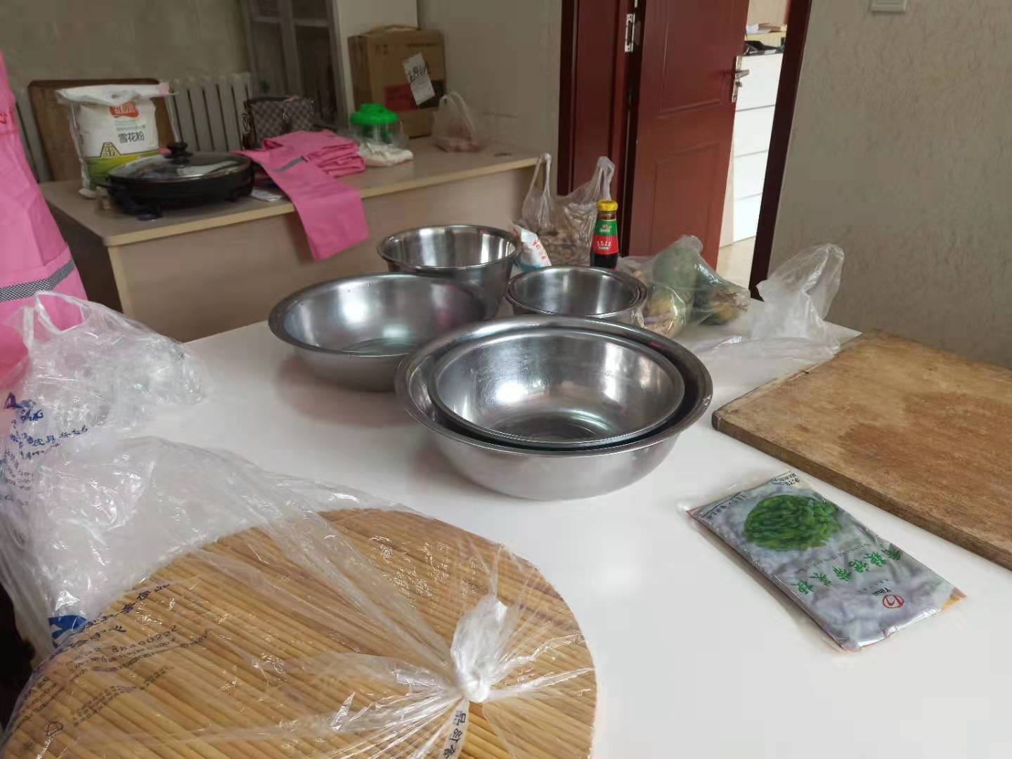 從前天開始領導和大姐們就開始準備了,今天一到公司就看到廚房里堆了一袋面粉、一袋雞蛋,還有面板、面盆、搟面杖等用具,一會大姐們還陸陸續(xù)續(xù)的帶來了韭菜、蕓豆、胡蘿卜、青蘿卜、芹菜,土豪的周經(jīng)理還送來了豬肉、大蝦。